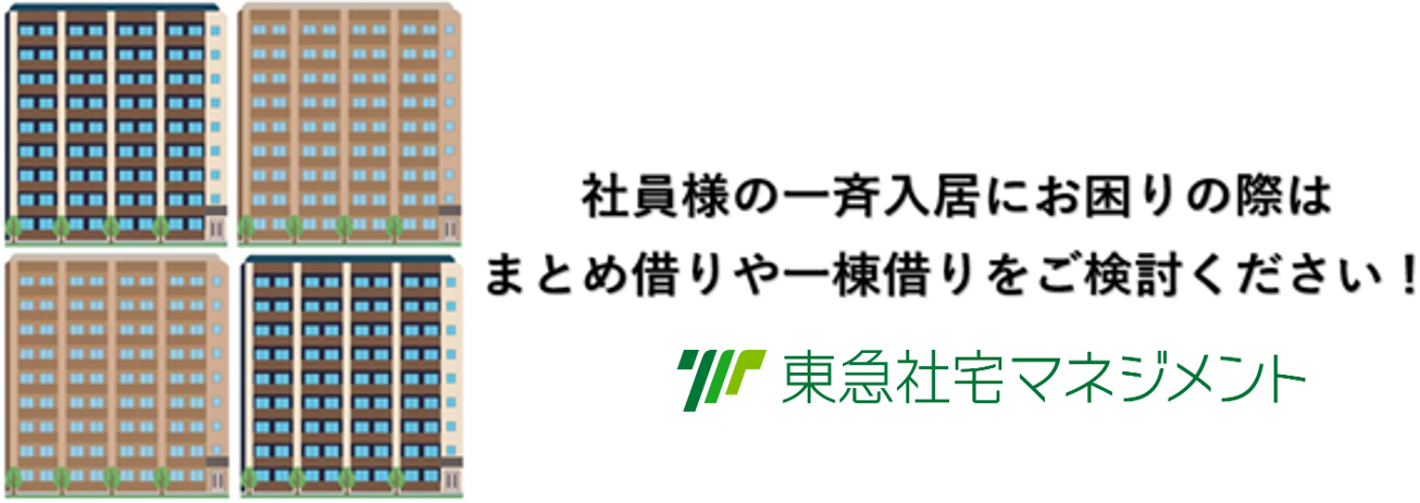 寮・社宅用の賃貸物件の1棟借りやまとめ借りについて、東急不動産ホールディングスグループをはじめとした豊富なネットワークから、一般募集開始前の情報も含め、貴社に最適な賃貸物件をご提案いたします。
